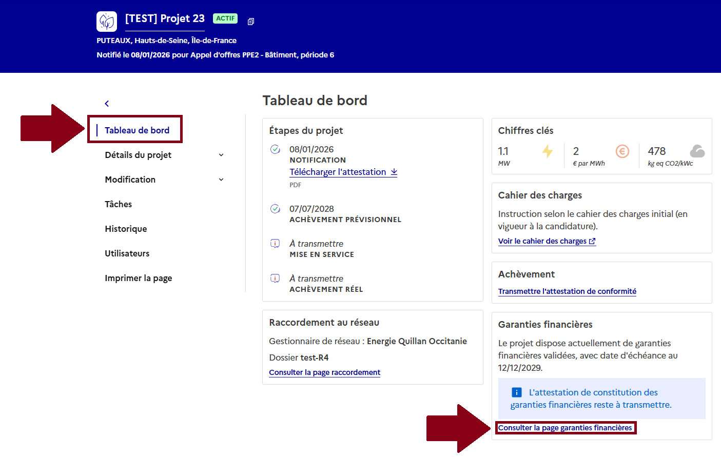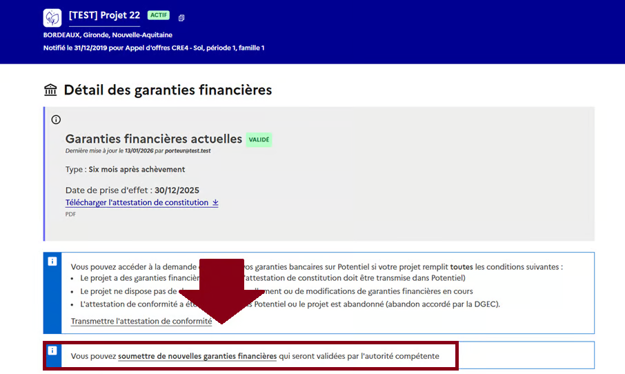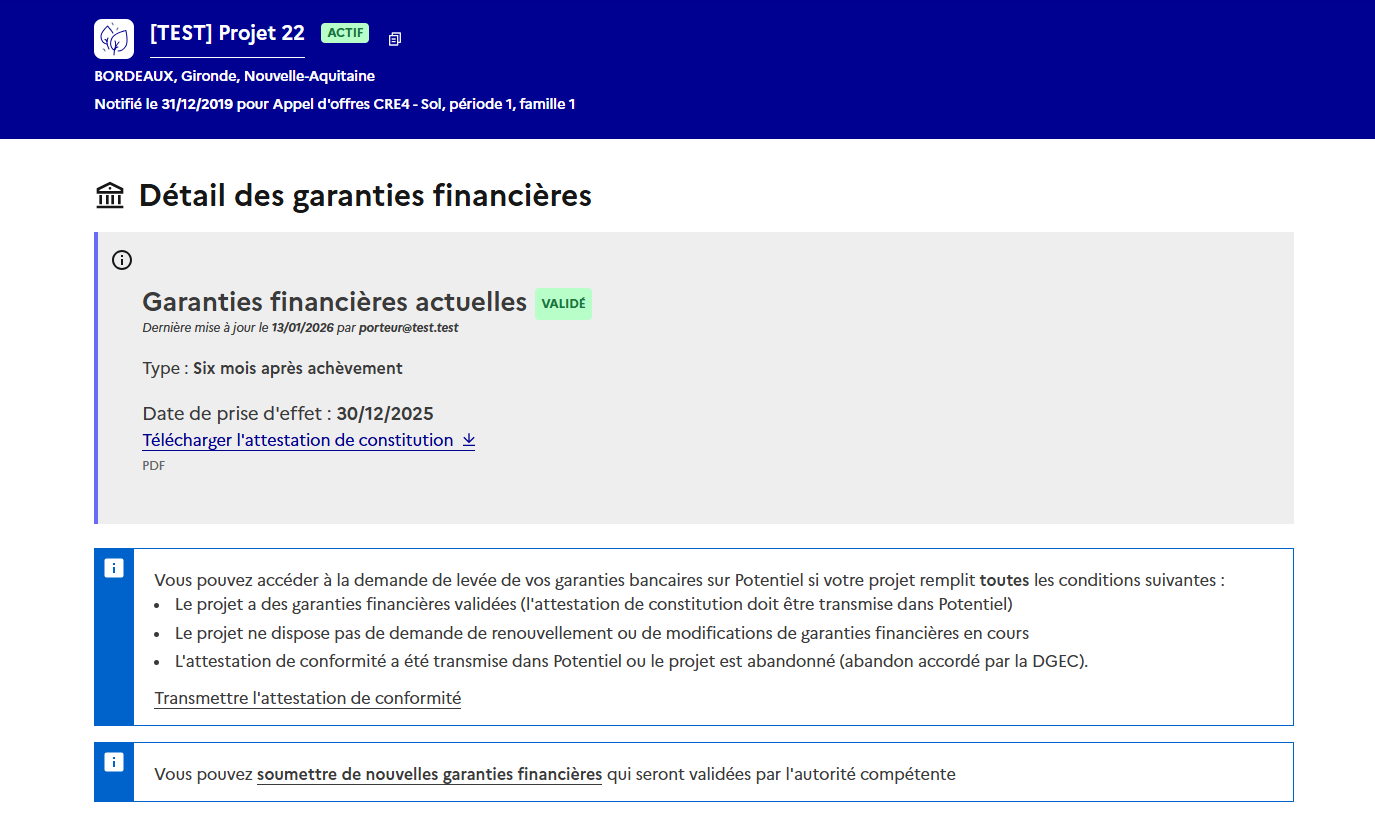 * Le module de gestion des garanties financières est maintenant adapté aux spécificités des appels d'offres PPE2 et CRE4 lorsque votre projet est soumis à garanties financières.