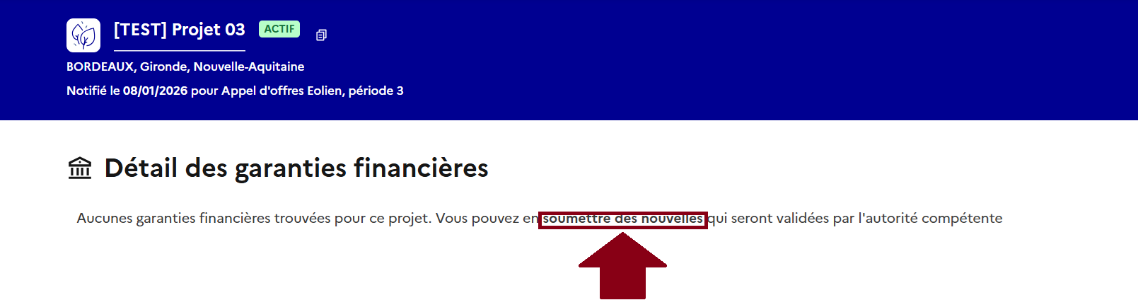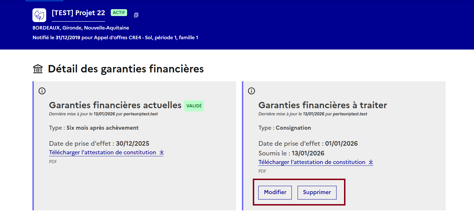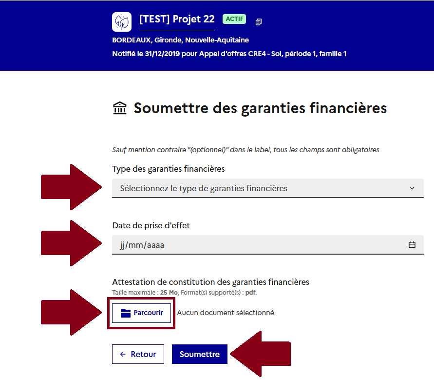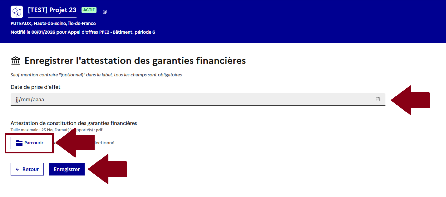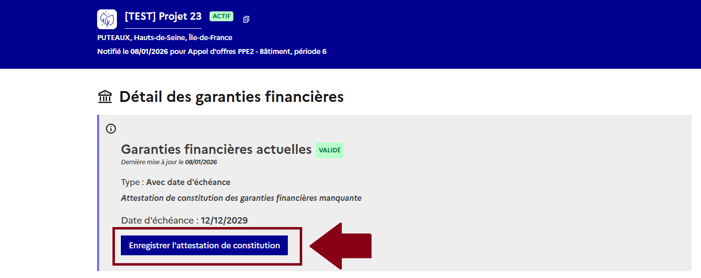 ### <mark style="color:blue;">**(Cas 2) Ajouter les différentes informations relatives à la garantie financière pour les appels d'offres PPE2 et CRE4 (date de constitution, attestation, etc.)**</mark>