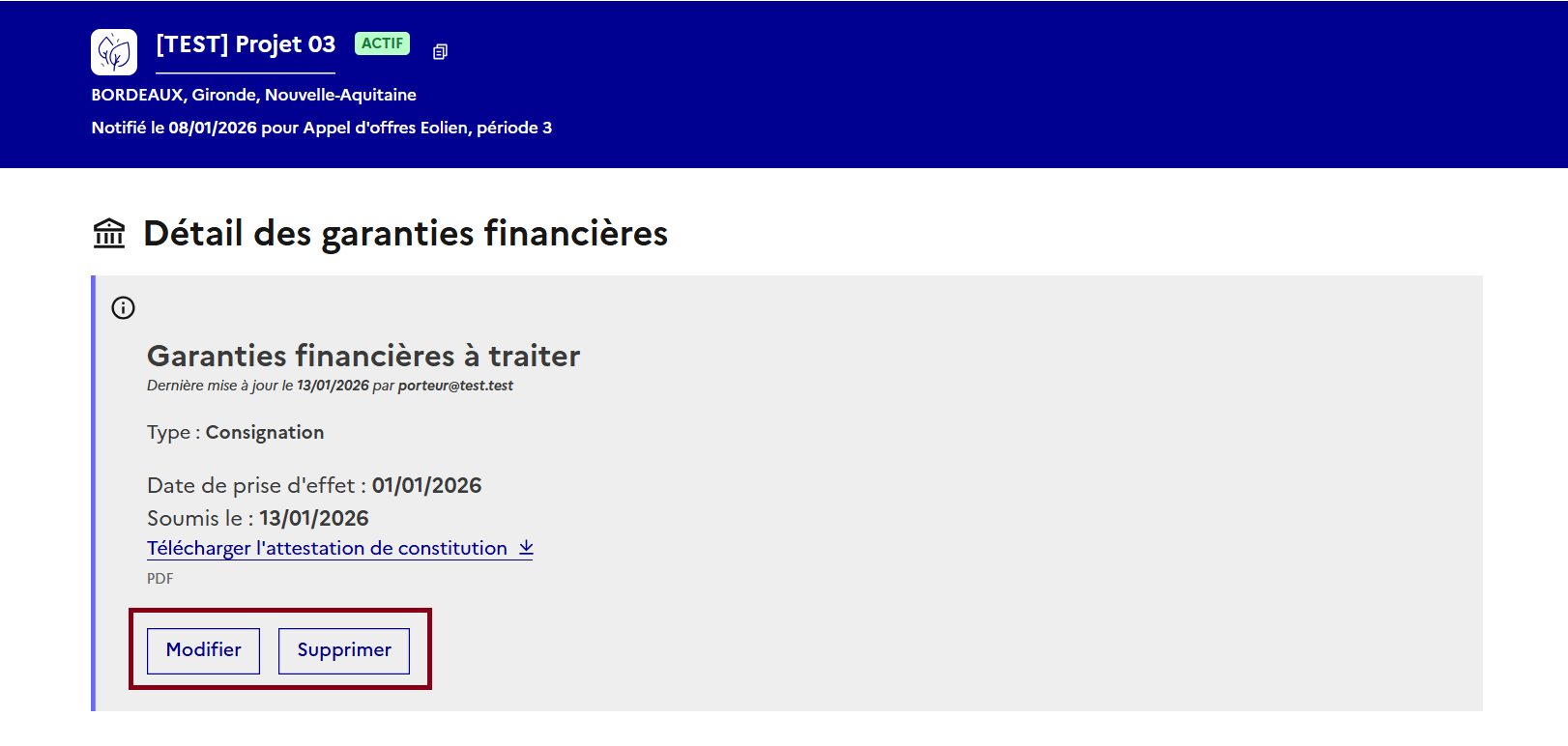 Vous pouvez avant que les garanties financières soient instruites, modifier ou supprimer ce dépôt&#x20;